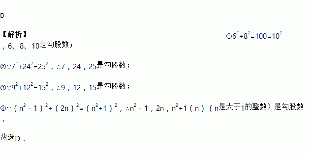 D 【解析】①62+82=100=102,6、8、10是勾股数; ②∵72+242=252,∴7,24,25是勾股数; ③∵92+122=152,∴9,12,15是勾股数; ④∵(n2﹣1)2+(2n)2=(n2+1)2,∴n2﹣1,2n,n2+1(n)(n是大于1的整数)是勾股数, 故选D.
