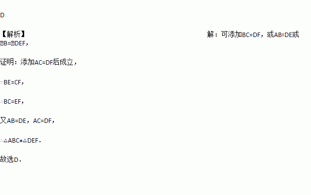 如图BE=CF,AB=DE,添加下列哪些条件可推证△ABC≌△DEF( )