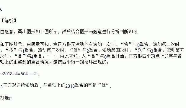 在正方形的四个顶点处逆时针依次标上“合”“格”“优”“秀”四个字,将正方形放置在数轴上,其中“优”“秀”对应的数分别为-2和-1,现将正方形绕着顶点按顺时针方向在数轴上向右无滑动地翻滚,例如第一次翻滚后“合”所对应的数为0,则连续翻滚后与数轴上数2018重合的字是( )
