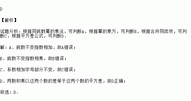 D 【解析】 试题分析:根据同底数幂的乘法,可判断A,根据幂的乘方,可判断B,根据合并同类项,可判断C,根据平方差公式,可判断D. 【解析】 A、底数不变指数相加,故A错误; B、底数不变指数相乘,故B错误; C、系数相加字母部分不变,故C错误; D、两数和乘以这两个数的差等于这两个数的平方差,故D正确; 故选:D.