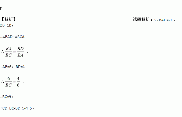 如图,△ABC中,D为BC上一点,∠BAD=∠C,AB=6,BD=4,则CD的长为____.