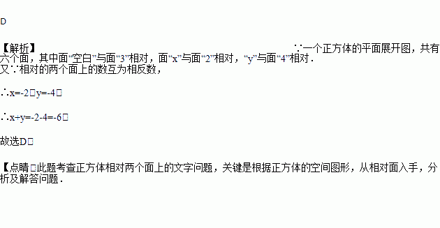 如图是一个正方体的表面展开图,相对面上两个数互为相反数,则x+y=( ).