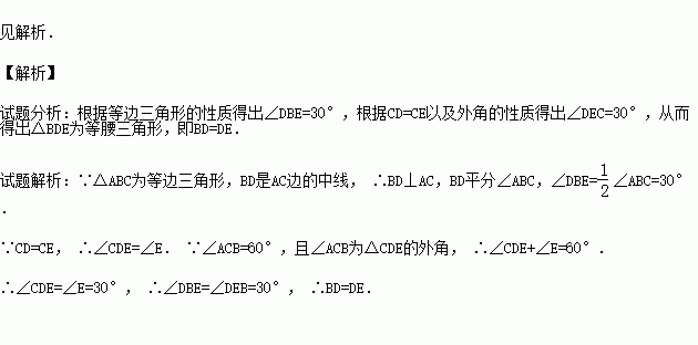 (7分)已知:如图,在等边三角形ABC的AC边上取中点D,BC的延长线上取一点E,使CE=CD.求证:BD=DE.
