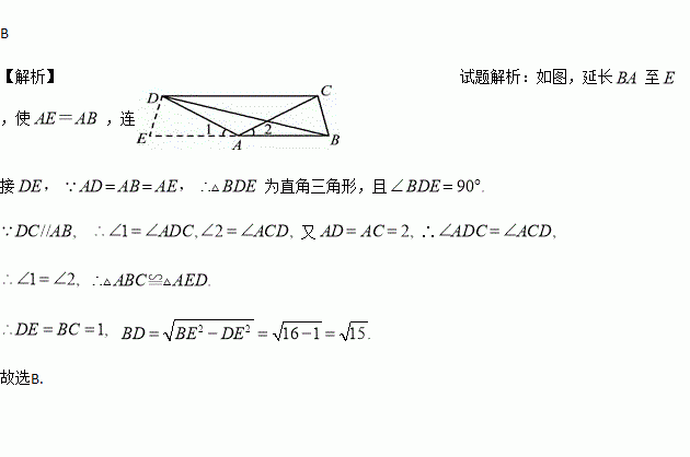 如图所示,四边形ABCD中,DC∥AB,BC=1,AB=AC=AD=2.则BD的长为( )