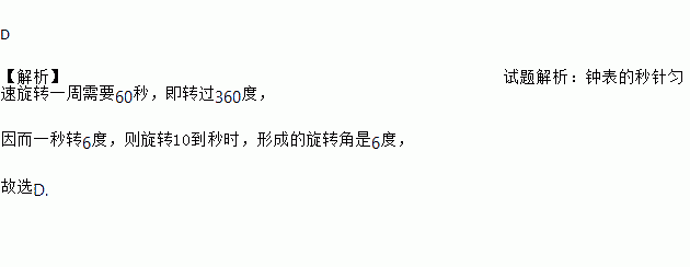 D 【解析】试题解析:钟表的秒针匀速旋转一周需要60秒,即转过360度, 因而一秒转6度,则旋转10到秒时,形成的旋转角是6度, 故选D.