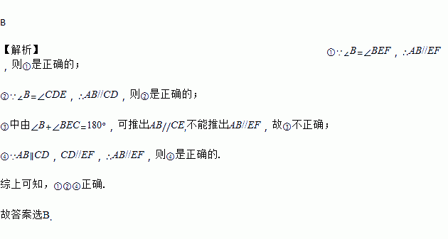 B ¡¾½âÎö¡¿¢Ù¡ß¡ÏB=¡ÏBEF£¬¡àAB//EF£¬Ôò¢ÙÊÇÕýÈ·µÄ£» ¢Ú¡ß¡ÏB=¡ÏCDE£¬¡àAB//CD£¬Ôò¢ÚÊÇÕýÈ·µÄ£» ¢ÛÖÐÓÉ¡ÏB+¡ÏBEC=180¡ã£¬¿ÉÍÆ³öAB//CE,²»ÄÜÍÆ³öAB//EF£¬¹Ê¢Û²»ÕýÈ·£» ¢Ü¡ßAB¡ÎCD£¬CD//EF£¬¡àAB//EF£¬Ôò¢ÜÊÇÕýÈ·µÄ. ×ÛÉÏ¿ÉÖª£¬¢Ù¢Ú¢ÜÕýÈ·. ¹Ê´ð°¸Ñ¡B.