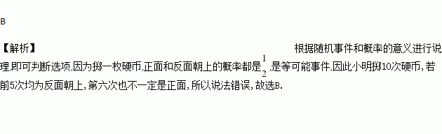 ,所以小明掷10次硬币,若前5次均为反面朝上,第六次一定是正面朝上