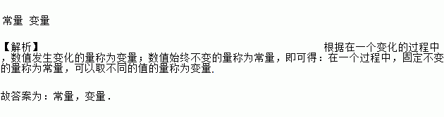 常量 变量 【解析】根据在一个变化的过程中,数值发生变化的量称为变量;数值始终不变的量称为常量,即可得:在一个过程中,固定不变的量称为常量,可以取不同的值的量称为变量. 故答案为:常量,变量.