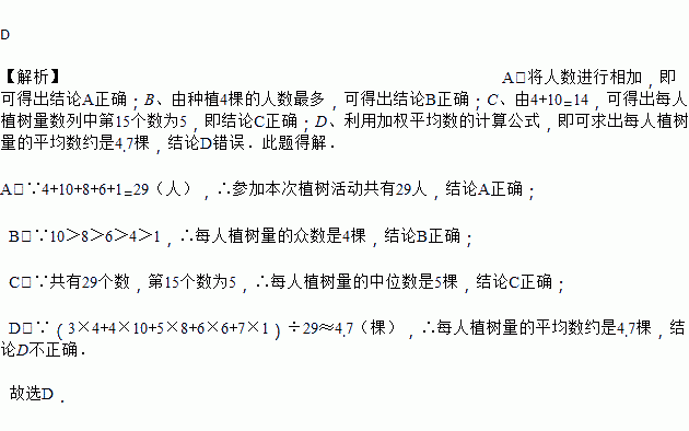 C. 每人植树量的中位数是5 D. 每人植树量的平均数是5
