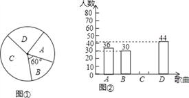 为庆祝建军90周年,某校计划在五月份举行“唱响军歌”歌咏比赛,要确定一首喜欢人数最多的歌曲为每班必唱歌曲.为此提供代号为A,B,C,D四首备选曲目让学生选择,经过抽样调查,并将采集的数据绘制如下两幅不完整的统计图.请根据图①,图②所提供的信息,