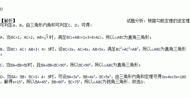 A. BC=1,AC=2,AB= ; B. BC:AC:AB=3:4:5