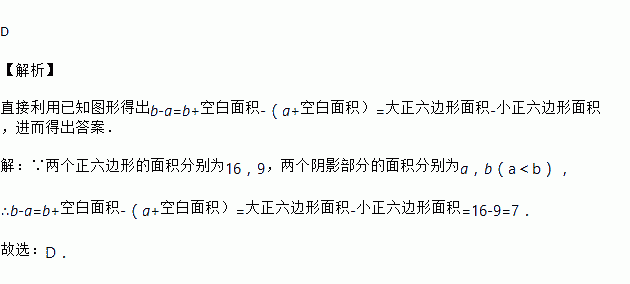如图,两个六边形的面积分别为16和9,两个阴影部分的面积分别为a,b(a<b),则b-a的值为( )