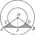 【答案】分析:根据图形可明显地看出阴影部分的面积为△OAB和扇形OCD的面积差.连接OP,可根据两圆的半径长求出AP的长和扇形OCD的圆心角.然后分别计算出△OAB和扇形OCD的面积,即可求出阴影部分的面积.