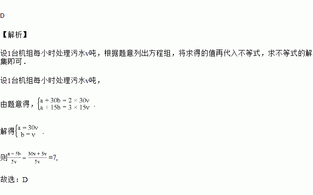 某市在“五水共治”中新建成一个污水处理厂. 已知该厂库池中存有待处理的污水a吨,另有从城区流入库池的待处理污水(新流入污水按每小时b吨的定流量增加). 若污水处理厂同时开动2台机组,需30小时处理完污水;若同时开动3台机组,需15小时处理完污水. 现要求用5个小时将污水处理完毕,则需同时开动的机组数为( )