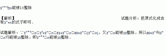 3m+4+n能被10整除 【解析】试题分析:把原式化成含有3m+n的式子即可. 试题解析:∵3m+4+n=34×3m+n=81×3m+n=80×3m+(3m+n),又3m+n能被10整除,所以80×3m与3m+n均能被10整除,即3m+4+n能被10整除.