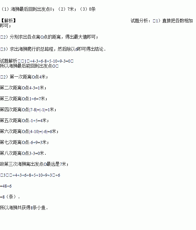 南山公园海狮馆为迎接“十一”黄金周,训练海狮做不同的游戏。海狮从某点O出发在一条直线上来回爬动。假定向右爬行的路程记为正数,向左爬行记为负数,爬行的路程依次为(单位米):