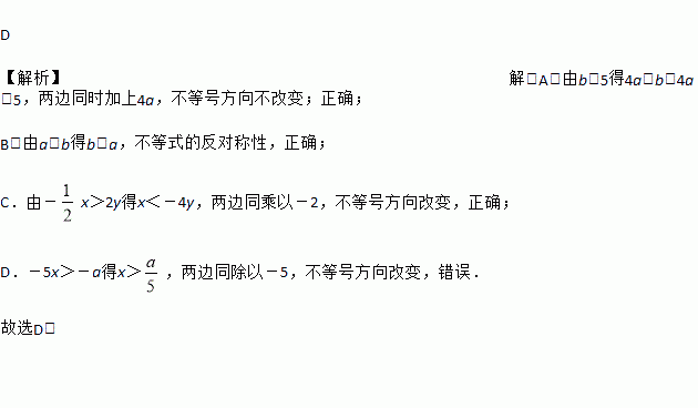 C. 由-x>2y得x<-4y D. -5x>-a得x>