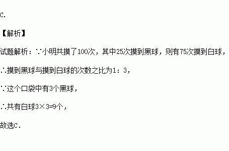 一个口袋中有3个黑球和若干个白球,在不允许将球倒出来数的前提下,小明为估计其中的白球数,采用了如下的方法:从口袋中随机摸出一球,记下颜色,然后把它放回口袋中,摇匀后再随机摸出一球,记下颜色,…,不断重复上述过程.小明共摸了100次,其中25次摸到黑球.根据上述数据,小明可估计口袋中的白球大约有( )