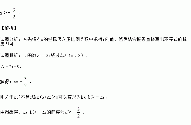 如图,函数y=﹣2x和y=kx+b的图象相交于点A(m,3),则关于x的不等式kx+b+2x>0的解集为 .