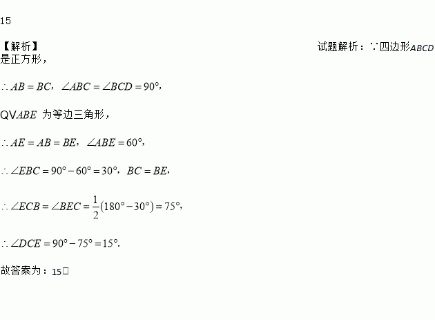 如图,E是正方形ABCD内一点,如果△ABE为等边三角形,那么∠DCE=____度.