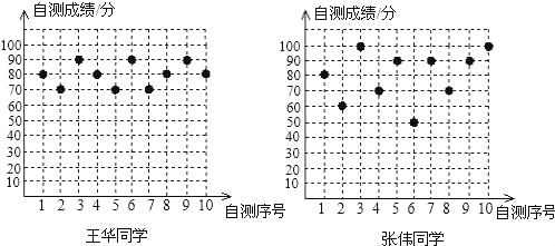 王华、张伟两位同学分别将自己10次数学自我检测的成绩绘制成如下统计图:
