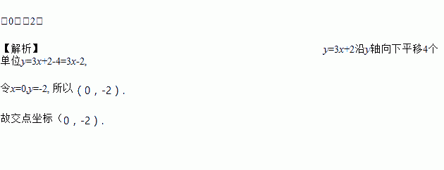 (0,-2) 【解析】y=3x+2沿y轴向下平移4个单位y=3x+2-4=3x-2, 令x=0,y=-2, 所以(0,-2). 故交点坐标(0,-2).