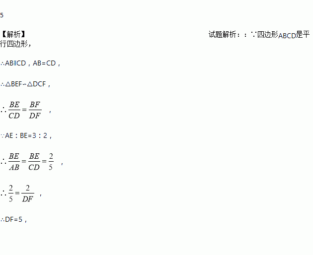 如图,在平行四边形ABCD中,E在AB上,CE、BD交于F,若AE∶BE = 3∶2,且BF = 2,则DF = .