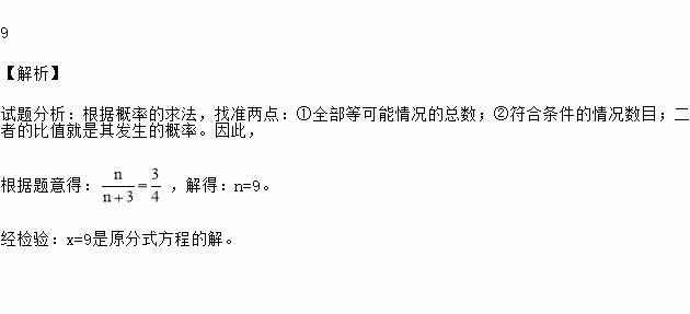 在一个不透明的口袋中有颜色不同的红、白两种小球,其中红球3只,白球n只,若从袋中任取一个球,摸出白球的概率为,则n= .