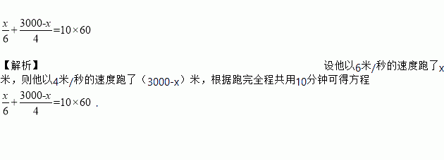 【解析】设他以6米/秒的速度跑了x米,则他以4米/秒的速度跑了(3000-x)米,根据跑完全程共用10分钟可得方程.