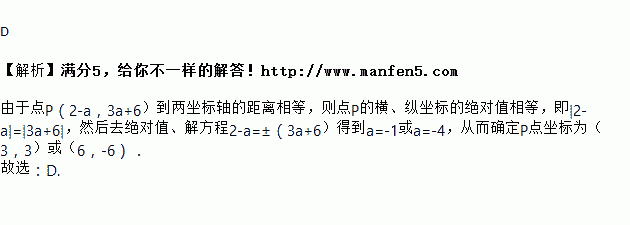 已知点P的坐标为(2-a,3a+6),且点P到两坐标轴的距离相等,则点P的坐标是( )