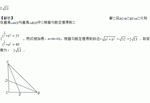 直角三角形中,自锐角顶点所引的两条中线长为5和,那么这个直角三角形的斜边长为_____.