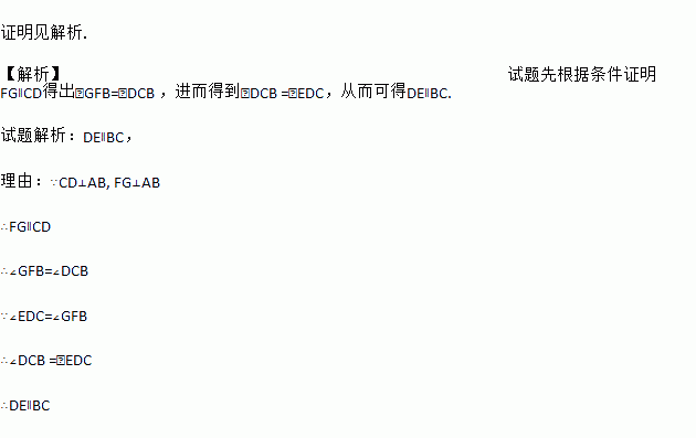 已知∠EDC=∠GFB,CD⊥AB 于 D,FG⊥AB 于 G,猜想 DE 与 BC 的关系,并说明理由.