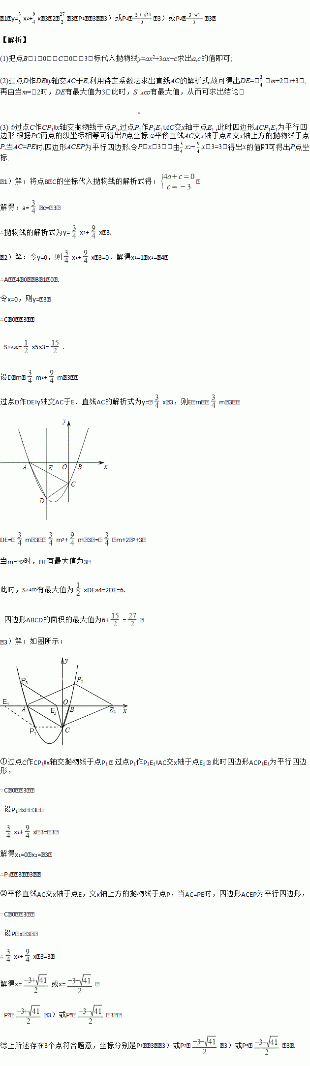 (3)若点E在x轴上,点P在抛物线上,是否存在以A、C、E、P为顶点且以AC为一边的平行四边形?如存在,求点P的坐标;若不存在,请说明理由.
