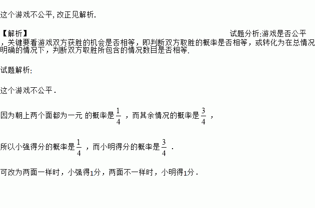 小强和小明两个同学设计一种同时抛出两枚1元硬币的游戏,游戏规则如下:如果抛出的硬币落下后朝上的两个面都为1元,则小强得1分,其余情况小明得1分,谁先得到10分谁就赢得比赛。你认为这个游戏规则公平吗?若不公平,怎样改正?