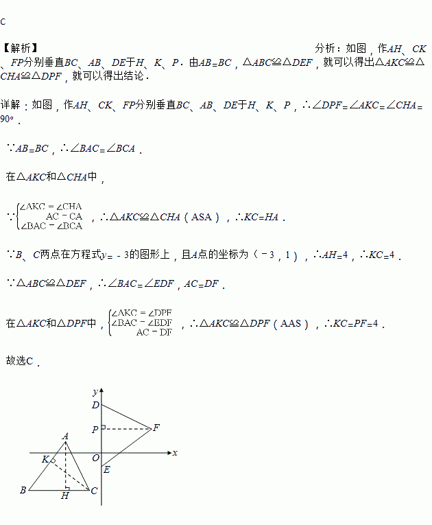 如图,平面直角坐标系中,△ABC≌△DEF, AB=BC=5.若A点的坐标为(﹣3,1),B、C两点在直线y=﹣3上,D、E两点在y轴上,则点F的横坐标为( )