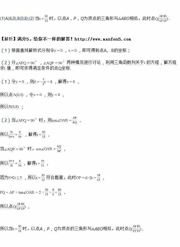 £¨2£©µ±tΪºÎֵʱ£¬ÒÔµãA£¬P£¬QΪ¶¥µãµÄÈý½ÇÐÎÓë¡÷ABOÏàËÆ£¬²¢Ö±½Óд³ö´ËʱµãQµÄ×ø±ê£®