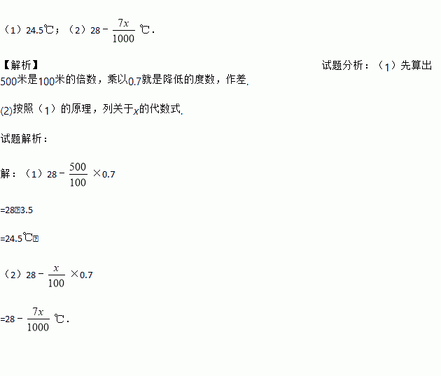 (1)24.5℃;(2)28﹣℃. 【解析】试题分析:(1)先算出500米是100米的倍数,乘以0.7就是降低的度数,作差. (2)按照(1)的原理,列关于x的代数式. 试题解析: 【解析】 (1)28﹣×0.7 =28﹣3.5 =24.5℃; (2)28﹣×0.7 =28﹣℃.