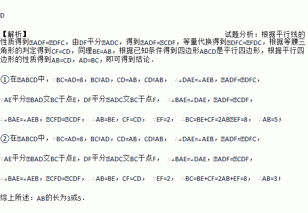 在?ABCD中,AD=8,AE平分∠BAD交BC于点E,DF平分∠ADC交BC于点F,且EF=2,则AB的长为( )