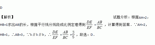 如图,直线l1∥l2∥l3,直线AC分别交l1,l2,l3于点A,B,C;直线DF分别交l1,l2,l3于点D,E,F.AC与DF相交于点H,且AH=2,HB=1,BC=5,则
