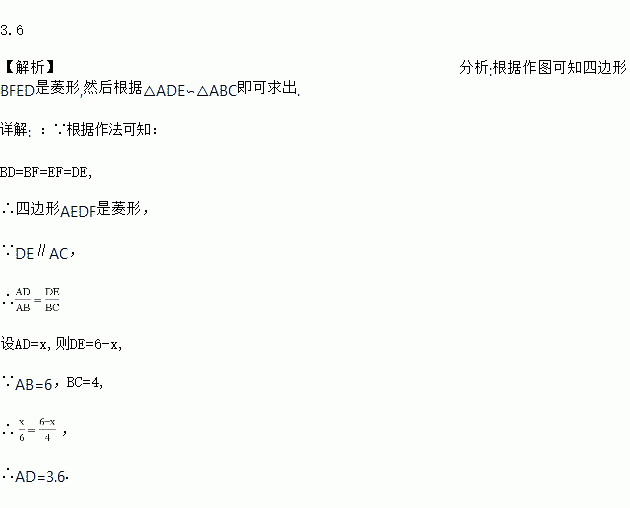 如图,在△ABC中,D是AB上的一点,进行如下操作:①以B为圆心,BD长为半径作弧交BC于点F;②再分别以D,F为圆心,BD长为半径作弧,两弧恰好相较于AC上的点E处;③连接DE,FE.若AB=6,BC=4,那么AD=________.