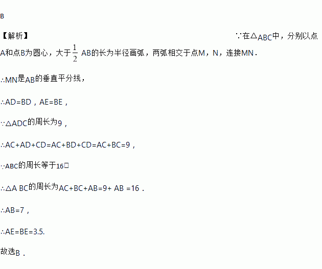 AB长为半径画弧,两弧相交于点M、N,连接MN,交BC于点D,交AB于点E,连接AD.若△ABC的周长等于16,△ADC的周长为9,那么线段AE的长等于( )