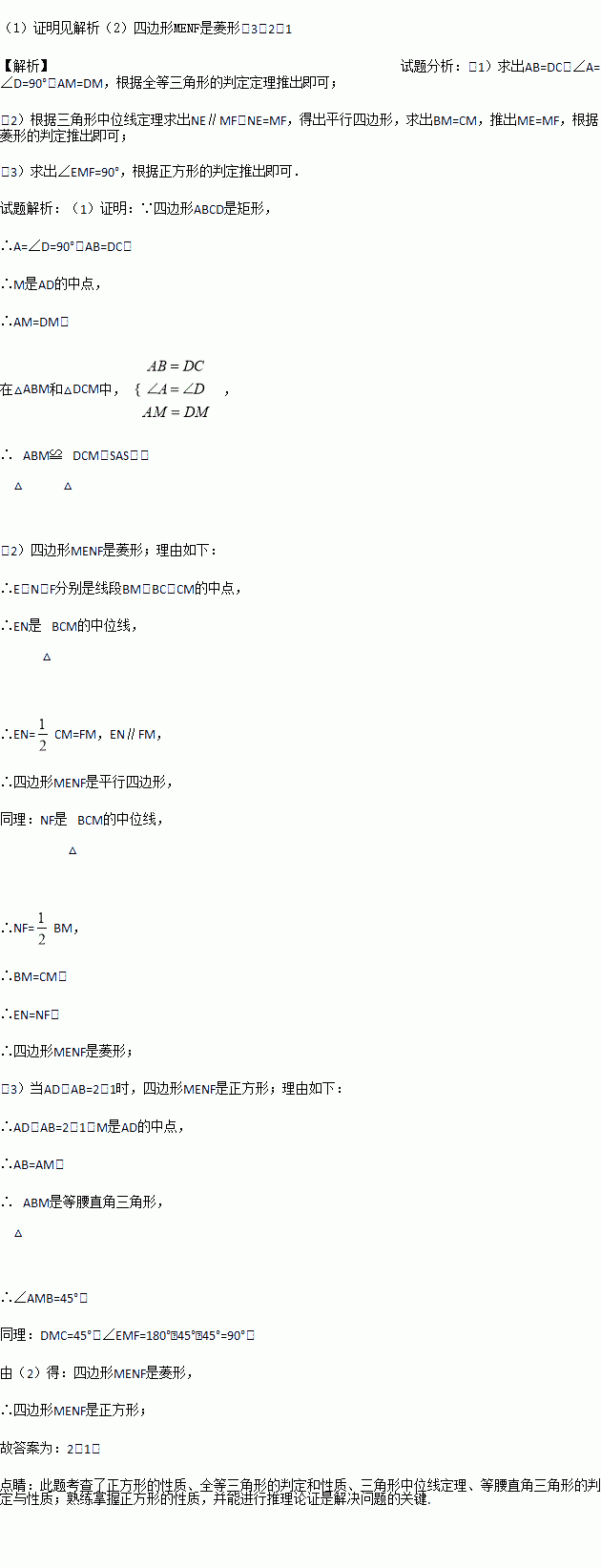 (3)当AD:AB的值为多少时,四边形MENF是正方形(只写结论,不需证明).