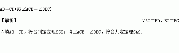 如图,已知AC=BD,要使△ABC≌△DCB,则只需添加一个适当的条件是________.(填一个即可)
