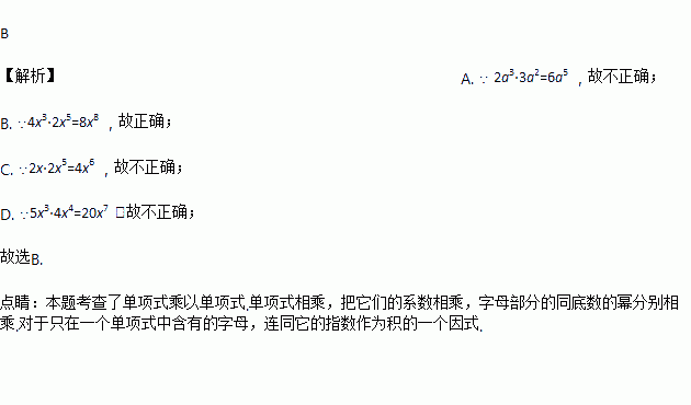 A. 2a3·3a2=6a6 B. 4x3·2x5=8x8 C. 2x·2x5=4x5 D. 5x3·4x4=9x7