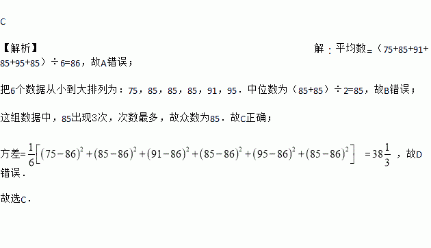 在一次中学生汉字听写大赛中,某中学代表队6名同学的笔试成绩分别为:75,85,91,85,95,85.关于这6名学生成绩,下列说法正确的是( )
