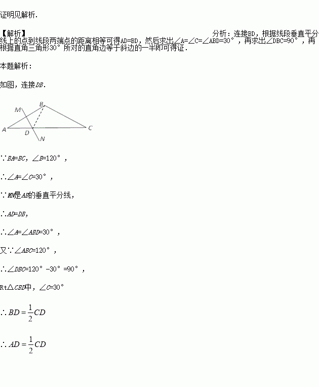 如图,在△ABC中,BA=BC,∠B=120°, AB的垂直平分线MN交AC于D,