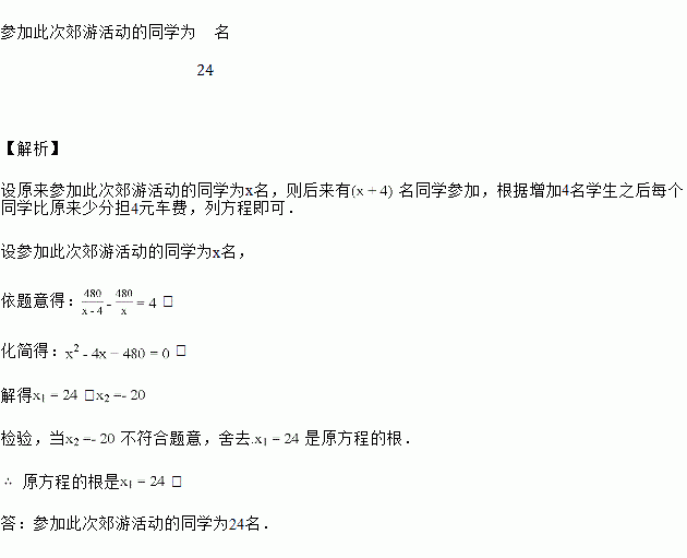 清明小长假期间,几名同学和家长共同租一辆车去郊游,租车的价位是480元,出发时又有4名学生参加进来,结果每个人比原来少分摊4元车费,请问一共有几个人参加此次郊游活动?