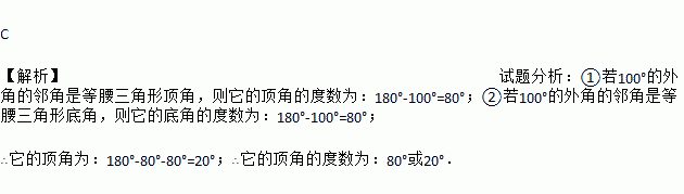 C 【解析】试题分析:①若100°的外角的邻角是等腰三角形顶角,则它的顶角的度数为:180°-100°=80°;②若100°的外角的邻角是等腰三角形底角,则它的底角的度数为:180°-100°=80°; ∴它的顶角为:180°-80°-80°=20°;∴它的顶角的度数为:80°或20°.