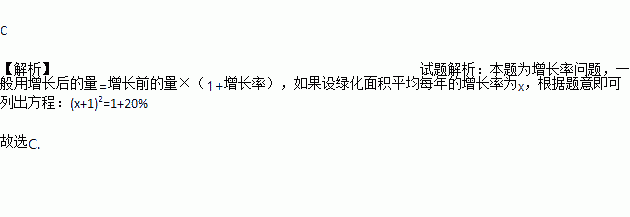 某小区为优化居住环境,计划经过两年时间使绿化面积增加20%,若每年增比率相同,设这个增长率为x,所列方程正确的是( )