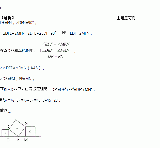 如图,直线l上有三个正方形A,B,C,若正方形A,C的面积分别为8和15,则正方形B的面积为( )